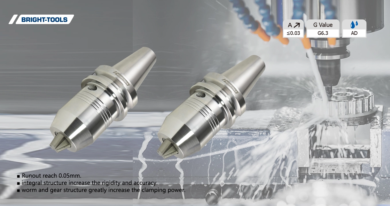 Mâm cặp khoan CPU BBT, sâu và cấu trúc bánh răng làm tăng đáng kể lực kẹp. Cấu trúc tích hợp làm tăng độ cứng và độ chính xác. Runout đạt 0.05mm. Quá trình sử dụng móng vuốt làm tăng khả năng chống mài mòn và tuổi thọ dụng cụ dài hơn.